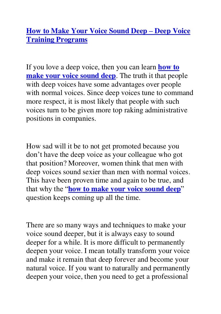 See how your data is managed. You want to know how to make your voice deeper? A deep voice is commonly associated with manliness and being male and, until recently, the majority of marketing from a male perspective has relied on the depiction of the male voice as being deeper in pitch, says vinny raval, a speech and language therapist, and director at the speech coach. Discover how to deepend your voice in these 3 easy & simple steps. How to instantly get a deeper voice.